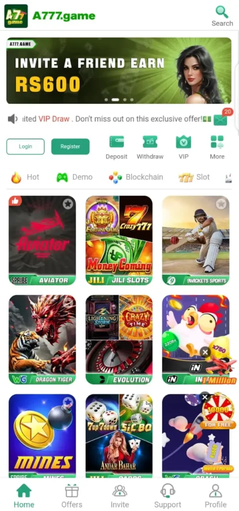 A777 Game is a real-money gaming platform where players can earn cash by participating in various types of prediction and casino-style games. The app offers small and large earning options, allowing users to choose games according to their skills, interest, patience, and luck. Players who make the right predictions can win instant rewards, which are added directly to their wallet inside the app. The platform is designed for anyone who wants easy income through simple online games that do not require professional knowledge or complicated strategies.