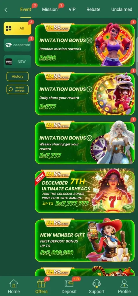 - Invite friends to join ZH88 and earn rewards.